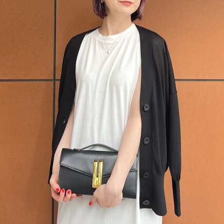 シャープなタッチと光沢が特徴の糸を使用したカーディガン。