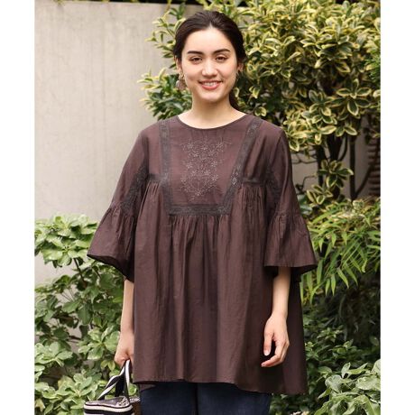 繊細なレースと刺繍がポイントの軽い着心地のチュニックブラウス。
