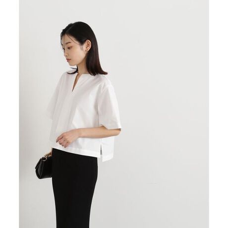 [design & styling]深めに入れたネックラインのスリットで、夏らしい抜け感のあるブラウスは、少し後ろに抜いて着るのもおすすめ。クロップド丈で、ややAラインシルエットに仕上げているので、今年らしいハイウエストボトムとも相性が良いアイテムです。ナロースカートとあわせて大人っぽくレディな着こなしも◎ミニマルなデザインなので着回しの幅も広い1枚です。[fabric]ハリのある素材で肌離れがよく、Aラインのシルエットもキレイに決まります。コットンタッチな表面感ですが、ポリエステル100%なので、シワになりづらいのがポイント。※裏地なし※モデルの着用画像の場合、光の当たり具合により、実際の色味と異なって見えることがございます。色味は、商品単体の画像をご参照ください。