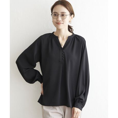 クルミボタンのナチュラルで可愛らしい雰囲気と、シャープなスキッパーネックのバランスが絶妙なブラウス。
