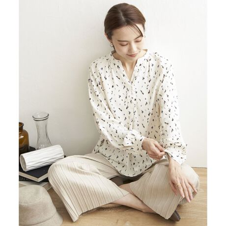 クルミボタンのナチュラルで可愛らしい雰囲気と、シャープなスキッパーネックのバランスが絶妙なブラウス。