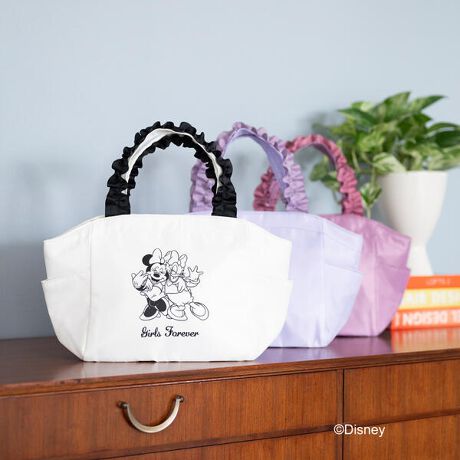 「Hello My Frends!」 国際フレンドシップをテーマにミニー&デイジーで女の子の友情を表した大人可愛いディズニーコレクション♪ 愛くるしいミニー&デイジーが中央にプリントされたフリルバッグです。 持ち手のフリルがかわいさアップのポイント♪お財布やペットボトルがすっぽり入るサイズ感でおでかけやお買い物にもぴったりです。