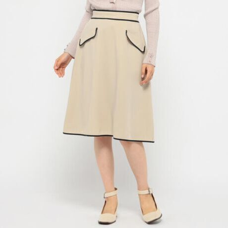 配色パイピングが目を惹くフレアスカートです。裾、ポケット、ウエストに施された配色がポイントです。通勤スタイルの定番アイテムとしてプラスしたい一枚です。