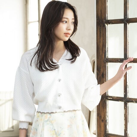 きらっと光るビジューモチーフのデザインボタンがおしゃれな長袖カーディガン。丸みのあるボリューム袖が今年らしいデザインポイント。コンパクトな丈感で、様々なボトムとバランスよくコーディネートできる一枚です。