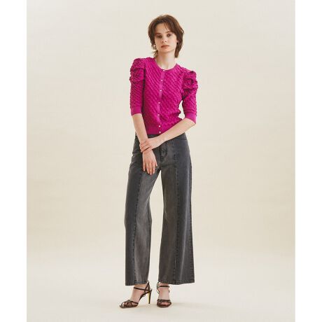 ポコポコとした表情豊かなふくれジャガードの編み柄が特徴的なカーディガン。袖にタックのディティールを取り入れた可憐なパフスリーブがポイント。トップス感覚で合わせて頂けるクルーネック&ショート丈。ふんわり軽い編地ながらもシックなカラー展開で、一足早く秋の気分を取り入れられる一品に仕上げました。