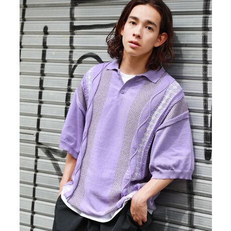 立体的な編地とレトロな柄が目を引くニットポロ。フロントはジャガード×ケーブルのミックス編みの豊かな表情が魅力的なアイテムです。ワイドな身幅と肩を落としたドロップショルダーが程よいルーズさで、合わせるだけで抜け感のある夏の着こなしを演出できます。ユニセックスで着用可能なので、男女問わず手軽に旬のコーディネートが楽しめるアイテムです。