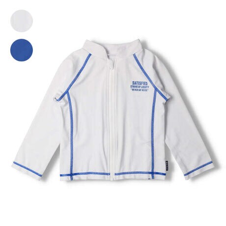 ラッシュガードは日焼け防止(紫外線防止)の保護として、スリ傷防止、キズ隠し用として、プール・海水浴などの今や必需アイテムです。UVカット加工生地を使っています。どんな海水パンツとも合わせやすいロゴプリント入りのシンプルデザイン。【アイテム】雑貨 カジュアル お洒落 オシャレ かっこいい かわいい 可愛い 普段着 デイリーウェア お出かけ 子ども こども 男児 男の子 ボーイズ キッズ ベビーサイズ トドラーサイズ 幼稚園 保育園 小学校 小学生 旅行 2022年夏物新作 丸高衣料 オフホワイト 白色 ブルー 青色 水着 海遊び 川遊び キッズフォーレ