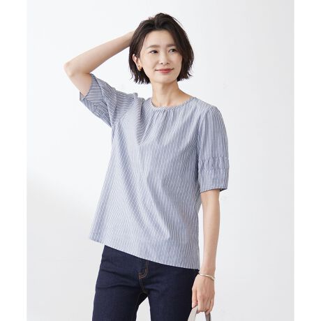 女性らしいボリュームスリーブでサマ見え!サラッとした肌触りのストライプブラウス