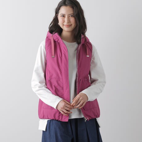 裏表同色系で色目を合わせた異素材コンビリバーシブルタイプの中綿入りベスト。