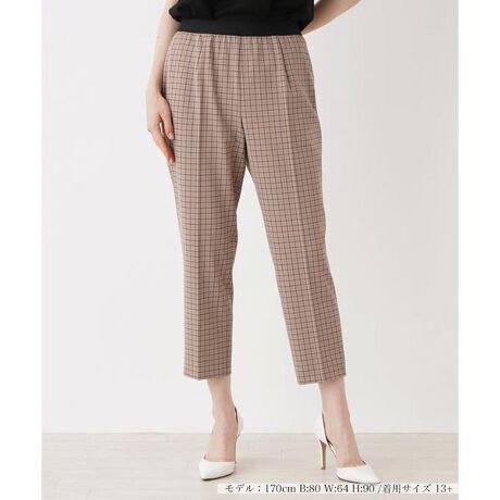 クラシカルな趣のチェック柄を表現した、センタープレス付きのクロップドパンツ。腿周りにゆとりをもたせつつ、裾に向かって絞り込んだテーパードシルエットがレッグラインをスマートに引き立てます。ウエストは総ゴム仕様とし、心地よいフィット感をもたせました。生地にはストレッチが効いているので足捌きもスムーズに行えます。------------------------------------夏あり色によりありなしやや薄手ウォッシャブル(手洗い可)なし総ゴム-------------------------------------※商品の色味は、撮影場所や光のあたり具合、お客様のお使いの機器により色味が違って見える場合がございます。予めご了承ください。 ■□Leilian WHITE LABEL(ホワイトレーベル)・・・実力派デザイナーとの協業で、ベーシックな商品によりトレンド性を取り入れたブランドです。□■
