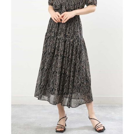 ボタニカル柄のシフォンプリントスカート。ティアード切り替えのアクセントでレディライクな印象で着こなせます。ウエストはゴム仕様でストレスフリーな着心地が嬉しい。