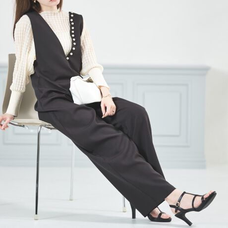 アシメに取り付けたパールがポイントのジャンプスーツは