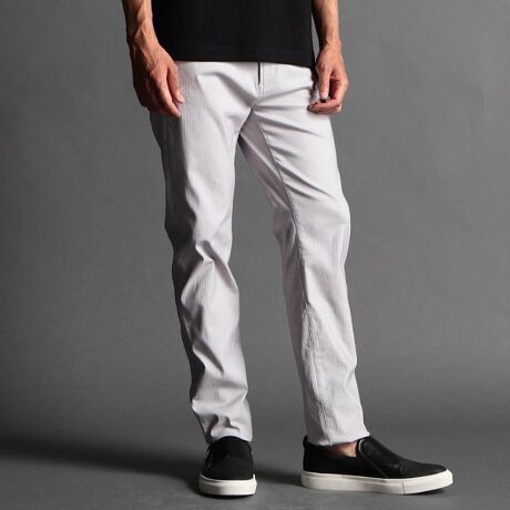 吸湿性の高い再生繊維のレーヨンとプリッとしたコシを出すナイロンを使用したヘリンボン柄のハイパーストレッチ素材。シンプルな5ポケットデザインパンツです。プリッとした張り感がありながら、ポリウレタン混の凄く伸びるストレッチ性、キックバックが利いた穿き心地が特徴で、合繊特有の上品な光沢感もあります。レーヨン糸からの接触冷感のデータも採れていますのでひんやりした肌触りは気持ち良いです。ウエストベルト部分も少し伸びる様に縫製を調整していますので締め付け感はなく、通常より小さく設定した細身スキニーシルエットの綺麗めパンツです。