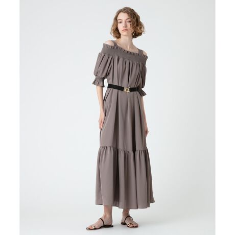 胸元と袖口にシャーリングを施したオフショルダーデザインのドレス。裾にティアードデザインを入れてボリュームを出しています。肩のストラップは広幅で安心感があり、取り外しも可能です。ゴムで作られた付属のベルトは金具使いが高級感を演出。全体に揺れ感のあるサマードレスです。