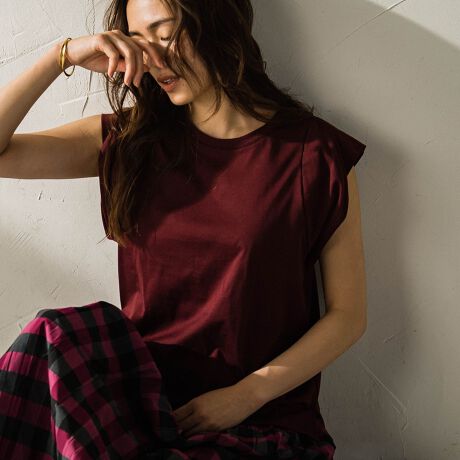 コンパクトなフレンチスリーブ、折り返したカーヴィな袖が女性らしいデザインのカットソー。