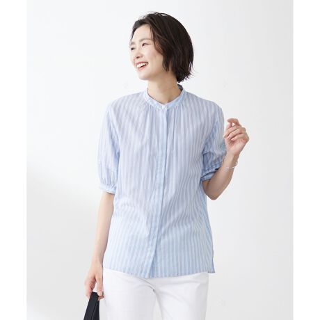 キチンとしたヒヨク仕立てで、夏のお仕事着にも!ストライプ柄が涼し気なバンドカラーブラウス
