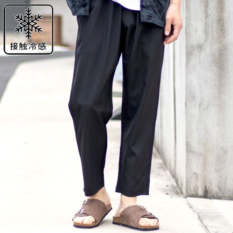 軽やかで肌触りの良い素材を使用した9分丈イージーパンツは、暑い季節でも快適に過ごせる接触冷感機能を備えています。