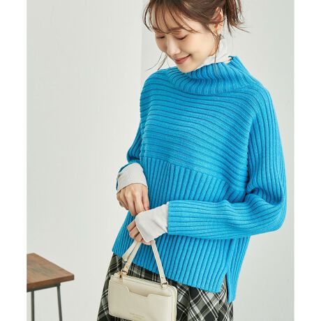 ・リブ編みの長袖ハイネックプルオーバー。
