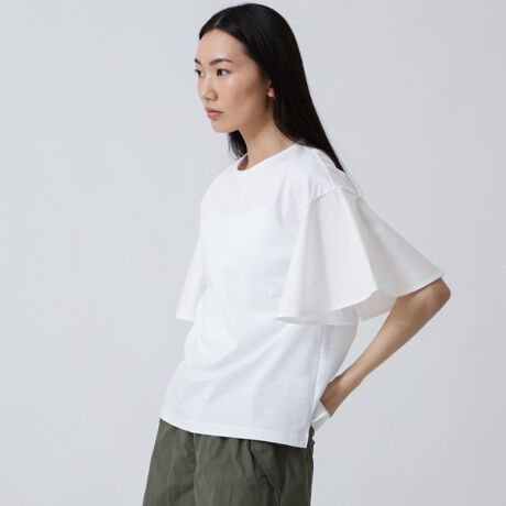 ドロップ袖の甘くならない丈感と、ウエストIN/OUTどちらでも対応できる着丈バランスが着回ししやすい一枚です。
