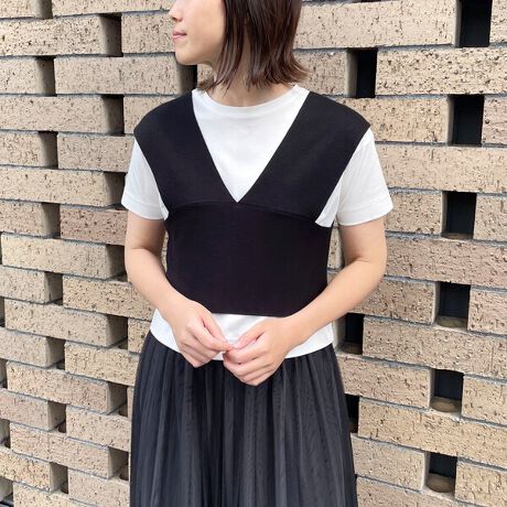 Tシャツやシャツに重ねるだけで旬なコーディネートになるニットビスチェ。