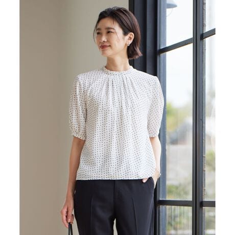 少し色を入れた、オリジナルの幾何学柄が華やかなカットソー。身頃はポリエステルのさらっとしたジャージと2枚重ねにしているので透け感なく、着脱もしやすいです。衿にタックを施して衿端をキリピコ始末にし、繊細な雰囲気を演出。袖丈はロングシーズンで着用できるよう肘上にし、幅広いシーンで活用するデザインです。