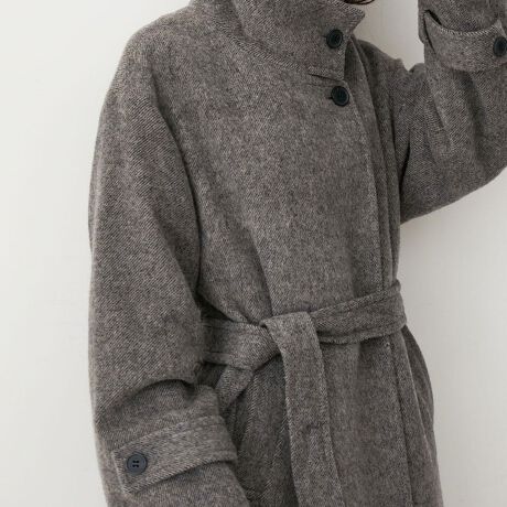 マフラーいらずの高めのスタンドカラーでのマニッシュな着方と、スタンドカラーの釦を開けて、大き目のラペルのようにしてフェミニンな着方の衿変化で2タイプの顔を持つコートです!