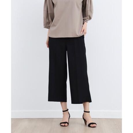 すっきりとしたシルエットのワイドクロップトパンツ。ウエスト周りをすっきりと見せつつ、後ろゴム仕様にすることで穿き心地の良さをプラスしました。程良い分量感とセンタープレスでつくるすっきりとしたシルエットと、シンプルなディテールで着回しやすい一着です。ストレッチの入った麻調素材で、ナチュラルな風合いながらもきちんと感もある、またシワになりにくくウォッシャブルでお手入れも簡単です。・裏地なし・ポケットあり・ウエスト後ろ部分ゴム仕様・水洗い可