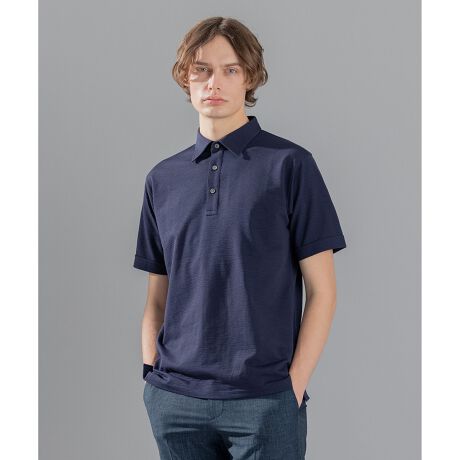 ■デザインレギュラーフィットのシンプルな半袖ポロシャツ。裾サイドにスリットあり。キチンと見えの素材でラフになりすぎない印象。ポケットなし。無地ながら凹凸ある編地による柄表現。