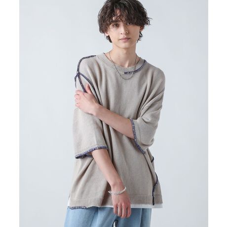 ランダムに施されたハンドステッチが目を惹くサマーニット。ルーズシルエットに深めのスリット、ざっくりめの編み地に袖までかかる長めの袖など、リラックスしたユルい雰囲気でこなれ感抜群のアイテムです。生地には通気性に優れた麻と綿の混紡素材を採用。さらっとした肌触りで暑い時期も快適にご着用いただけます。