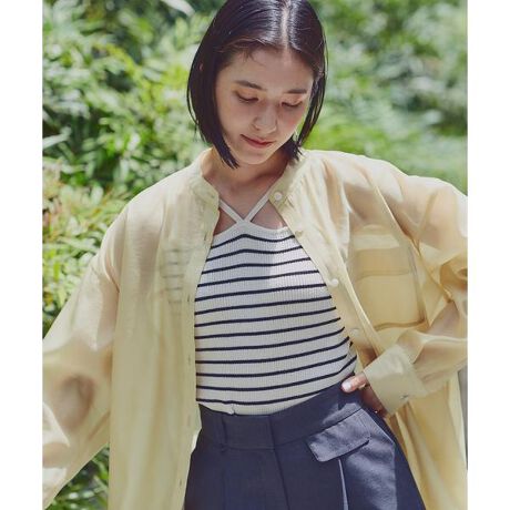 [型番:1663270753]今年らしい表情に見せてくれるホルターネックニット。キャミソール型にホルターネックを組み合わせた抜け感あふれるデザインです。透け感のあるシアーシャツやカーディガンを羽織っていただくのがお勧め。ボトムスを選ばず、総柄パンツや無地のマキシスカート、カジュアルなデニムパンツとも相性バツグンです。