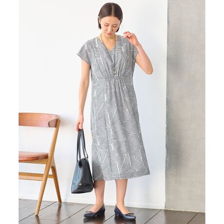 リゾート感のある大胆なプリントが映えるサックワンピース■デザイン南仏のタイルプリントを元に作成した自由区オリジナルプリントのサックワンピースです。規則的なタイルモザイクの要素を残しつつ不規則なパッチワーク調に変えることで、リゾートを思わせるような大胆なプリントにしました。手描きタッチにすることで、ラインに濃淡の表情を出しています。Vネックですっきりとしたシルエットながら、ゆとりがあるのでボディラインを拾いにくいデザイン。前のウエスト部分にゴムギャザーディティールを入れることで、程よく華やかさを出しつつ、ウエスト周りを気にせずに着て頂けます。■素材しなやかな風合いとドレープ感のある素材で仕立てることで、落ち感のあるすっきりとしたシルエットを実現。素材は薄手のローンで、ソフトで少し膨らみがあります。シワになりにくく、イージーケアな点もポイント。