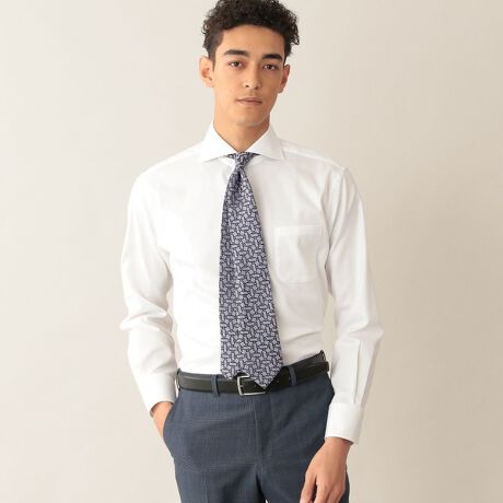 ノーネクタイでもタイドアップでも兼用できる汎用性の高いホリゾンタルカラー(カッタウェイ)を採用した長袖ドレスシャツ。