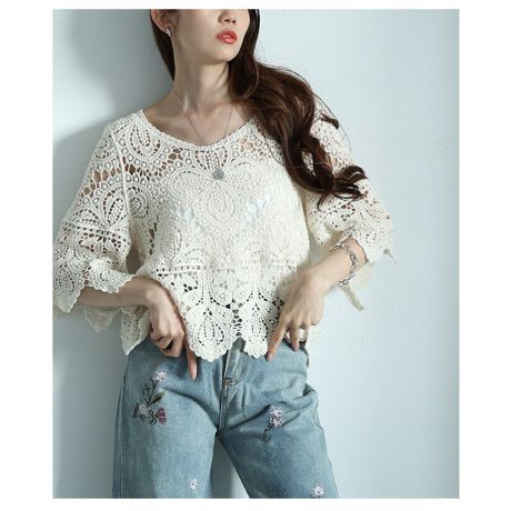 重ねても涼しげな華やかクロシェ編みトップス。気になる肌の露出をカバーしながらお洒落見せしてくれます。フレアスリーブなので気になる二の腕周りをカバーします。綿素材なので通気性があり夏の時期でも涼しく快適です。眠っていたノースリーブ服が蘇る1枚は持っていたいトップスです。