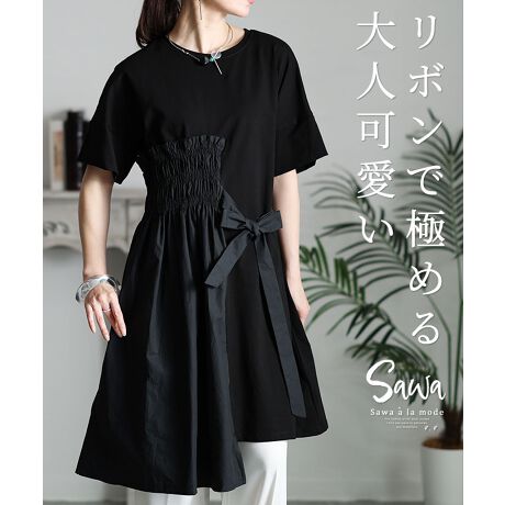 ウエストのリボンはお好みで調整可能。カットソー素材にハリのある生地がドッキングされたお洒落な一枚です。ふんわりと広がるラインが美しく、腰まわりのカバーもしてくれます。