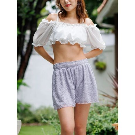 ショーツはブラと合わせた同色のシンプルデザイン。ショーパンは総レースに仕上げ、スタイリングもフェミニンに決まる華やかなアイテムです。ほんのりシアーな透け感で華奢?え&スタイルアップも叶えるおすすめの水着です。