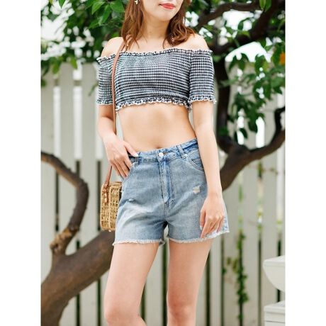 ショーツはブラと合わせた同柄のギンガムチェックでレトロガーリーに仕上げました。デニムはダメージ加工を施したヴィンテージなルックで、ヘルシー&アクティブなスタイリングも楽しめるアイテムです。
