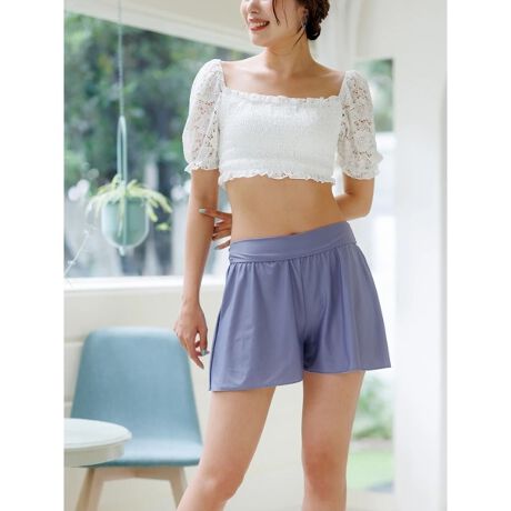 ショーツとキュロットパンツはシンプルな無地タイプ。キュロットはふんわりとしたシルエットに仕上げ、気になるお尻や太ももの付け根を優しくカバーしてくれます。