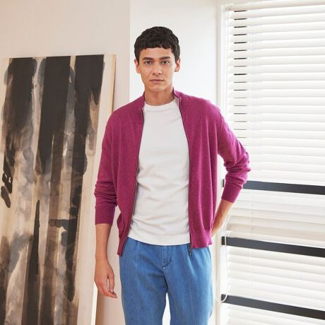 イタリアメーカーのコットン糸を使用した、肩肘張らないナチュラルさとリッチな存在感が大人の男性にぴったりなジップアップ長袖ニット。