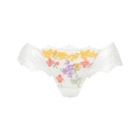 [型番:PCL437]・フロントは裏打ち付きで透けにくい・繊細なリジッドレースにカラフルな刺繍のエンブロイダリーレースを重ね、アップリケをちりばめた、特別感のあるデザイン・ウエストのギャザーがポイント・前身頃のアップリケにはクリスタル付き