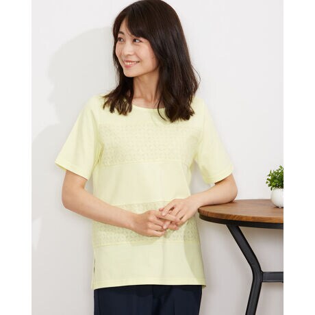 同色のレース素材を切り替えに使用したデザインTシャツ。メリハリの効いた爽やかな4色展開です。ぱっと見無地ですがレースの質感がポイントになるアイテムです。