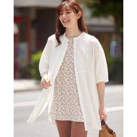 [型番:472J6314]シャーリング組織をストライプ柄に配したチュニックです。ゆったりしたボックスシルエットなのにタテ柄がすっきり見せてくれます。