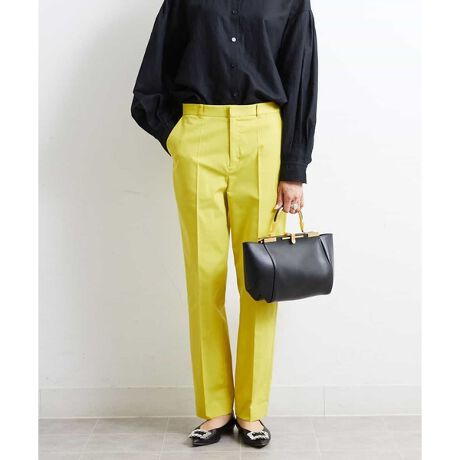 発色の良さを感じられる大人キレイなカラーパンツが、スタイリングにアクセントを加えます。オーバーサイズリネンシャツのブラック[FMBGS01210]にイエローのパンツ合わせがおすすめスタイル。