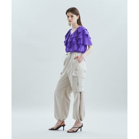 フリルを重ねた程よいボリューム感が大人可愛い、ロマンティックなブラウス。天然素材のような風合いを持ちながら、清涼感のあるさらっとしたシアー素材を使用。ボリュームがありますが、すっきりとした首元で甘すぎない表情に仕上げました。気になる二の腕をさりげなくカバーしてくれるのも、大人に嬉しい点。お揃いのスカートとセットで着用するとワンピース風の着こなしも楽しめます。