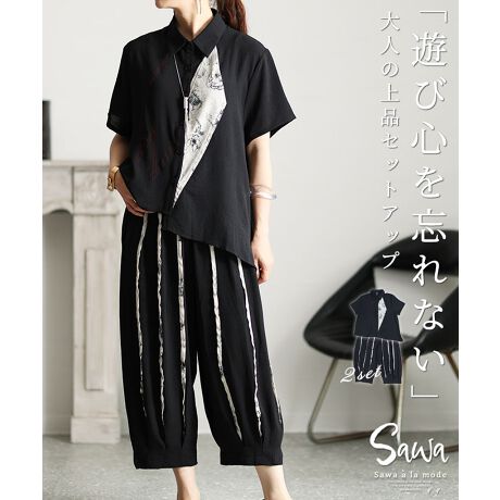 左右アシンメトリーのデザインシャツとバルーンシルエットのパンツのセットアップです。トップスはステッチとフラワープリント生地が目を惹くデザインです。ボトムスにも同じフラワープリント生地でストライプにあしらっており、オシャレなデザインです。セットでも別々でもコーディネートを楽しんでいただけます。