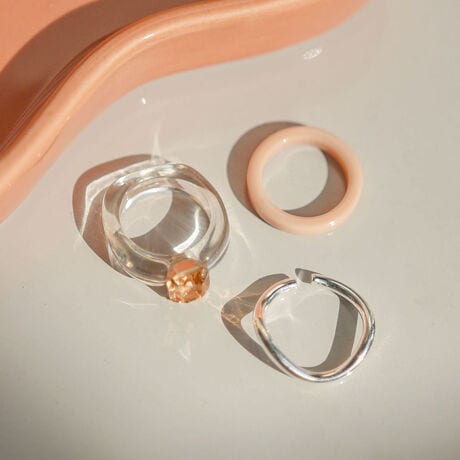透明感のあるきれいめビジューリングとやさしいパステルカラーのアクリルリングにシンプルデザインでどんなコーデにもつけられるシルバーリングを合わせた3点セットになります。