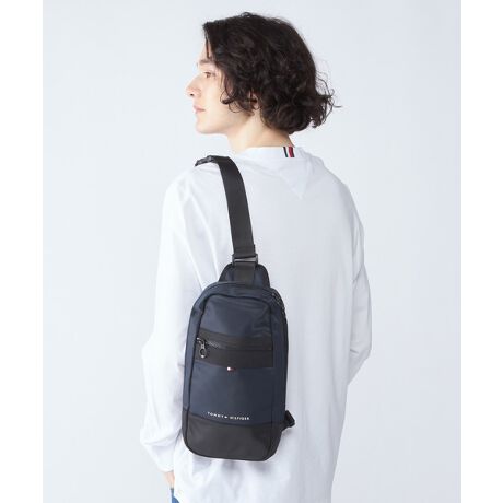 前面にブランドロゴのマイクロブランディングをあしらったスリングバッグ。縦長のスリムなボディが身体にフィットします。ショルダーストラップは左右どちらにも装着が可能。開口はどのようなポジションでも開閉や荷物の出し入れがスムーズにできるダブルジップを採用しています。