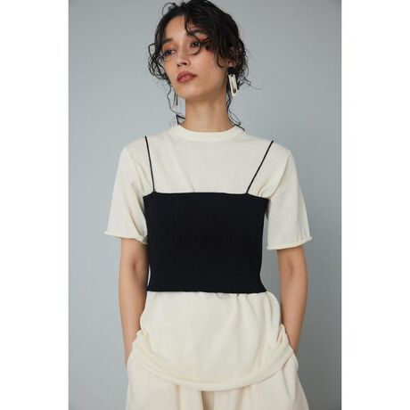バイカラービスチェがセットになったレイヤードTシャツ。カジュアルスタイルの定番半袖Tシャツも、ニット素材にすることでキレイめ見せが出来るアイテム。ビスチェがついている事で様々なコーディネートに取り入れやすく、盛夏の着こなしを楽しませてくれます。イージーケアで使いまわしに便利なので、ワードローブにもっていたい1枚です。Layered knit tops(レイヤード ニット トップス)