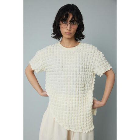 凸凹とした生地の表面感が楽しいアシメTシャツカット素材で表面の凹凸が印象的な1枚で、ヘムラインをアシンメトリーデザインに仕上げています。夏場に簡単になりがちなスタイリングも、見た目が印象的なTシャツを取り入れることで一味違う見え方を演出してくれます。パンツスタイルはもちろん、スカートでも合わせやすいアイテムです。Popcorn asymmetry tops(ポップコーン アシンメトリー トップス)