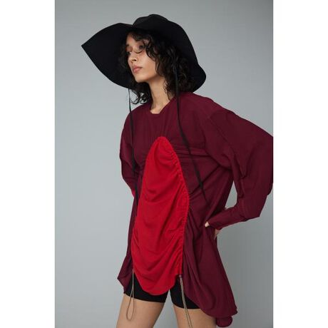 “MIZU-GIWA collection”水着の上から羽織るビーチシーンも、想定したメッシュ素材のフレアートップス。フロント部分のドロストデザインが印象的な一枚で、絞り具合を調整することでシルエットの変化を楽しめるデザインとなっています。パネル配色やドロストデザインなど、随所にブランドの味を盛り込んだHERIN.CYEらしいアイテムに仕上がりました。水際はもちろんアウトドアでもシティーでもマルチに着用していただけます。Squeeze flare tops(スクイーズ フレアー トップス)