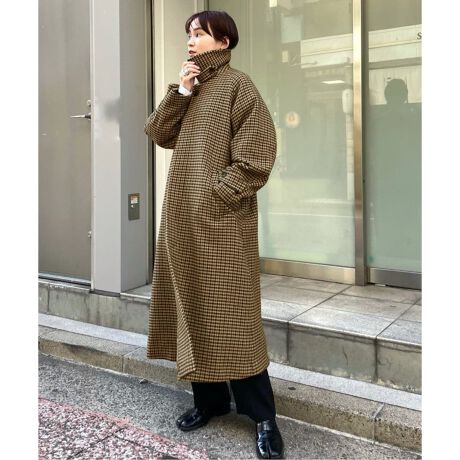 全体的にゆとりと丈のある大き目シルエットですが、体に沿わせた肩のラインや袖のサイズ感などを大きくなりすぎない絶妙なバランスで調整し、大人がゆるく楽しめるステンカラーコートのサイズ感になっています。スタンドカラーにして着ていただけるところも好ポイントです。